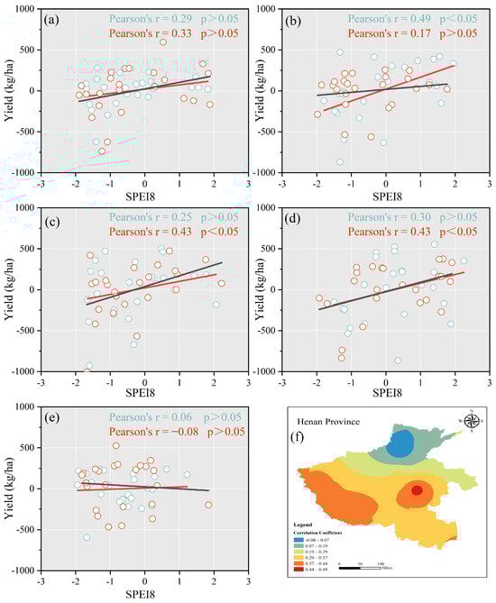 The relationship between winter wheat detrended yield and SPEI8 in Henan province. (a) Central Henan: cyan represents Zhengzhou, red represents Xuchang; (b) Eastern Henan: cyan represents Zhoukou, red represents Kaifeng; (c) Western Henan: cyan represents Luoyang, red represents Sanmenxia; (d) Southern Henan: cyan represents Xinyang, red represents Nanyang; (e) Northern Henan: cyan represents Anyang, red represents Xinxiang; (f) Spatial distribution of related trends in Henan Province.