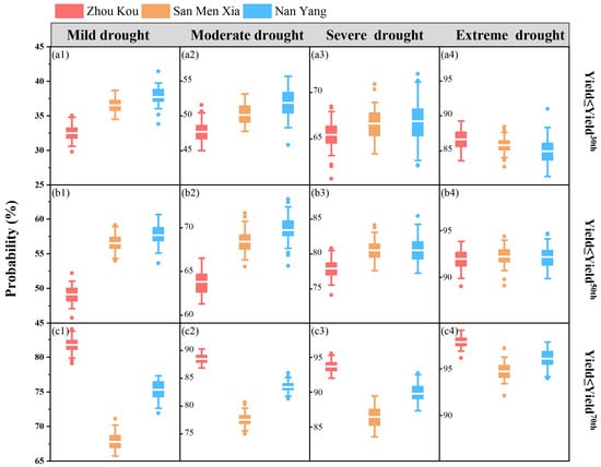 Conditional probability of yield loss below the 30th, 50th, and 70th percentiles for different drought severities in the growing season of winter wheat under different climate scenarios. (a1,b1,c1) are mild drought, (a2,b2,c2) are moderate drought, (a3,b3,c3) are severe drought, (a4,b4,c4) are extreme drought.