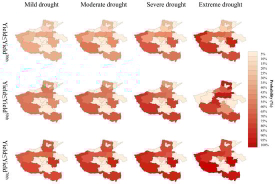 There is a significant correlation between the SPEI and the detrended yield in the Zhoukou, Sanmenxia, and Nanyang regions. Using the dependence between the two in the Copula function, the conditional probabilities of winter wheat yield loss below 30,50, and 70 percentiles under different drought conditions from 2000 to 2023 were simulated. The results are shown in Figure 6. When the loss is below the 30th percentile, the yield is reduced by 70%. The lower the percentile, the more significant the proportion of yield loss. Under mild drought conditions, the conditional probability of yield loss below 30% was 33%, 37%, and 38%, respectively. Under 50%: 49%, 57%, and 58%; below 70% are 82%, 68%, and 75%; the probability of loss level below 30 percentile < below 50 percentile < below 70 percentile, and the rules under other drought conditions are also consistent. With the increase in winter wheat yield loss (Figure 6), the probability of yield loss under the same drought condition decreased. In addition, from mild drought to extreme drought, the higher the degree of drought, the higher the probability of yield loss. For example, the probability value of Zhoukou below the 30th percentile increased from 33% to 87%.