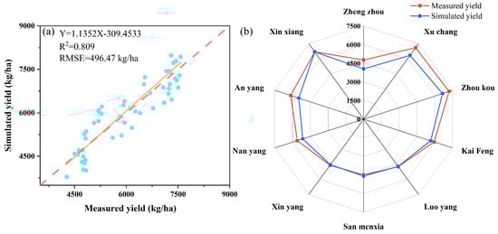 This study considered the effects of meteorological and soil factors on winter wheat yield. Specifically, we used the meteorological data set from 2000 to 2023, containing 8766 observation days (5 meteorological parameters) (8766, 5). These parameters include average wind speed, relative humidity, temperature, sunshine hours, precipitation, and time identification (year, month, and day) (8766, 3). The total sample size of the data set is (8766, 8). The study mainly analyzed the meteorological data during the growth period of winter wheat. The total number of samples was 5832 observation days, and the average annual growth period was 243 days (24,243, 8). In addition, one of the key parameters of the soil data set is Saturated water content, and the dimension of the data matrix is 7560 rows × 4320 columns. These soil data use the D-WGS-1984 coordinate reference, and the depth of each pixel is 32 bits. In order to construct the CNN-LSTM model, we first divide the data set into a training set and a test set according to a ratio of 82. Before the model training, we normalized the data and used the sliding window technique to construct the time series data. Through these preprocessing steps, the prediction results of the model are finally obtained. Based on the PyCharm (2024 edition) development environment, this study uses Python 3.11 to implement and train the CNN-LSTM model. The results of the measured data on winter wheat yield in 10 national stations from 2018 to 2022, combined with the CNN-LSTM model simulation data, are shown in Figure 8a. The simulated data points are evenly distributed around the 1:1 line, suggesting that the model prediction performance is good, the error is small, and the model prediction accuracy is high, R2 is as high as 0.809, and RMSE is 496.47 kg/ha. Figure 8b compares the output observations of various regions in Henan Province in 2018 and the output values simulated by the CNN-LSTM model. Each axis in the figure represents a region. The value on the axis represents the yield (kg/ha), the red point represents the yield observation value, and the blue point represents the simulated yield value. It can be seen from the figure that the trend of simulated yield and measured yield is similar, and the difference between the two data sets is slight, indicating that the model performs well. The figure can help evaluate the applicability and accuracy of the model in different regions. Further analysis shows that. Further analysis shows the relative error of Zhengzhou, Xuchang, Zhoukou, and Anyang four stations is slightly larger than that of Kaifeng, Luoyang, Sanmenxia, Xinyang, and Nanyang six stations, which may be due to these four stations’ small annual yield changes. In contrast, the meteorological data changes considerably, affecting the balance of the model training data set, ultimately leading to the model’s underestimation of winter wheat crop yield. In short, the simulated yield of the model is consistent with the measured yield, which proves that the prediction model constructed by combining a CNN with LSTM has good performance. The excellent prediction results of winter wheat in Henan Province also show that applying the model in regional winter wheat yield prediction is feasible and valuable.