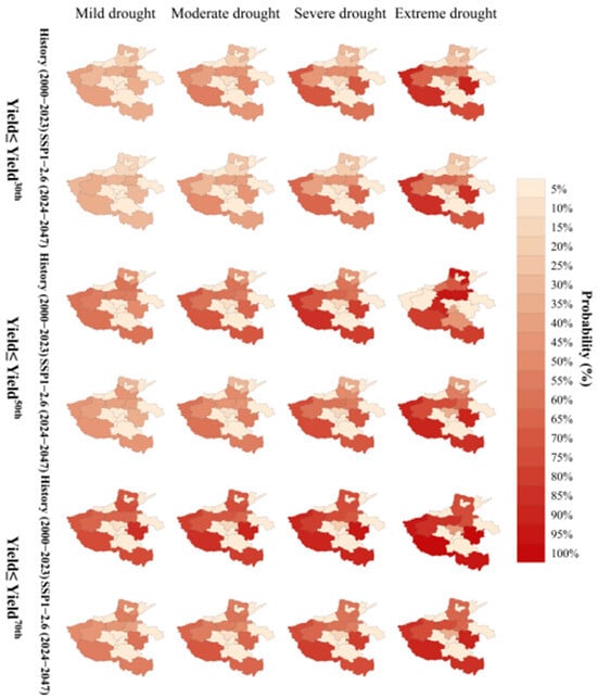 As mentioned above, the drought vulnerability in southern and eastern Henan is relatively high. Taking these two regions as an example to analyze further the data in Table 5, the drought thresholds for yield level losses below 30 (50/70) percentiles in Zhoukou, Kaifeng, Xinyang, and Nanyang in the historical period (2000–2023) are 1.47 (−0.97/0.69), −2.18 (−1.80/−0.75), −1.86 (−0.85/0.60) and −1.45 (−0.75/−0.17), respectively. The drought thresholds under the SSP1-2.6 (2024–2047) scenario increased by −0.77 (−0.64/−0.41), −0.68 (-0.56/−0.33), −0.61 (−0.54/−0.25), and −0.71 (−0.59/−0.26). Other meteorological stations also have the same phenomenon. These results indicate that some areas are prone to yield reduction under mild drought conditions in the past, and moderate or severe drought may be required in future scenarios to achieve the corresponding yield loss level.