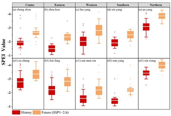 As mentioned above, when the conditional probability exceeds 60%, this drought index can be used as a drought threshold to trigger the loss of yield. The conditional probability under different drought scenarios is different. This study uses conditional probability to quantify the drought threshold under different yield level losses in history (2000–2023) and future (2024–2047) (SSP1-2.6). The results are shown in Table 5. According to the different drought thresholds, the higher the drought threshold, the higher the drought vulnerability, the lighter the drought, the greater the loss of yield, and vice versa, the more severe the drought. In addition, this study took the threshold of winter wheat yield loss less than the 30th percentile (yield reduction of 70%) in ten meteorological stations in Henan Province as an example (Figure 10). It analyzed the variation characteristics of drought thresholds in ten meteorological stations to provide a reference for local agricultural management departments to adopt countermeasures. Figure 10 shows that the drought threshold under the SSP1-2.6 (2024–2047) scenario is significantly lower than in the historical period (2000–2023). This result is consistent with Figure 9, indicating that higher drought conditions are required under the SSP1-2.6 (2024–2047) scenario to cause winter wheat yield loss.