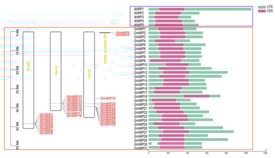 Chromosomal distribution and gene structure of the GmWIP genes. The GmWIP genes are located on chromosomes Gm06, Gm12, Gm13, and Gm06_scaffold301. The gene structures of the five AtWIP genes and 31 GmWIP genes are represented within blue and red boxes, respectively. Non-coding regions (UTRs) are indicated by green boxes, while coding sequences are shown in purple boxes. The x-axis represents the length of the GmWIP genes from 5′ to 3′.