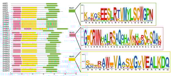 To explore the conserved regions within the GmWIP proteins, motif analysis was performed using the MEME tool, identifying three unique conserved motifs (designated as Motifs 1–3; Figure 2). The lengths of these conserved motifs ranged from 21 to 27 amino acids. For example, Motif 1, comprising 21 amino acid residues, was present across all AtWIPs and GmWIPs (Figure 2), while AtWIP1, AtWIP2, GmWIP4, GmWIP10, GmWIP16, GmWIP22, and GmWIP29 did not contain Motifs 2 and 3 (Figure 2).