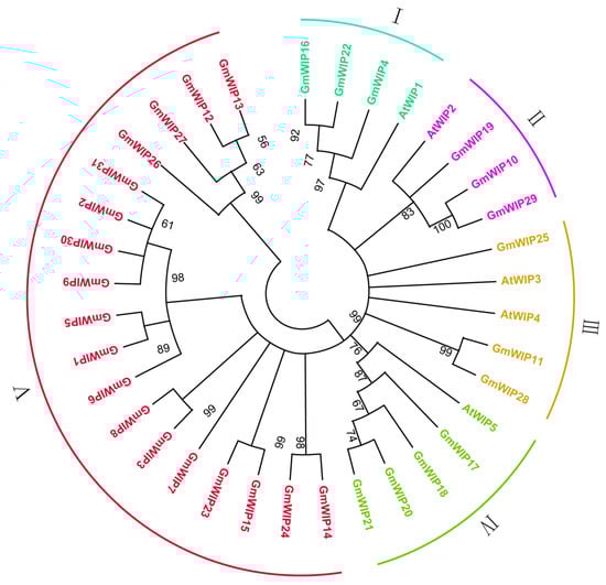 For protein classification, a phylogenetic tree was constructed using the NJ method, with 1000 bootstrap replicates based on the amino acid sequences of the 31 identified GmWIP and five AtWIP proteins. The phylogenetic tree grouped the GmWIP and AtWIP proteins into five distinct clades (groups I–V) according to the tree’s topology (Figure 3).
