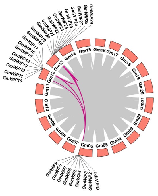 To investigate the expression mechanisms of the GmWIP gene family, a collinearity alignment within the soybean genome was conducted. This analysis revealed that 29 GmWIP genes are located within syntenic blocks on soybean chromosomes (Figure 4 and Supplementary Material S2).