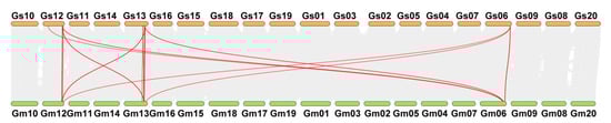 Collinearity analysis of the wound-induced polypeptide gene family between Glycine soja and Glycine max. The gray lines represent collinear blocks between G. soja and G. max. The red lines highlight syntenic gene pairs within the wound-induced polypeptide family. Gs represents Glycine soja, and Gm represents Glycine max. Chromosome numbers are indicated.