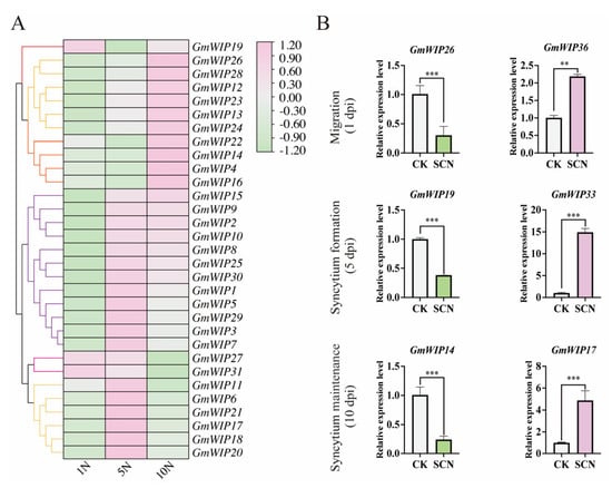 Expression analysis of GmWIP genes under soybean cyst nematode infection. (A) Heatmap of GmWIP gene expression at different stages of soybean cyst nematode infection. Log2-transformed qRT-PCR values were used to create the heatmap, with genes exhibiting similar expression patterns clustered together. 1N, 5N, and 10N present the relative expression level of soybean roots inoculated with nematodes compared with non-nematode-infected roots at 1 dpi, 5 dpi, and 10 dpi. (B) The most significantly downregulated and upregulated GmWIP genes at different SCN infection stages (1, 5, and 10 dpi). “**” and “***” represent p < 0.01 and p < 0.001, respectively.