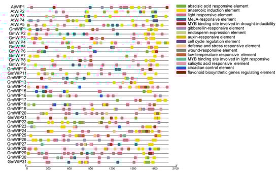 Cis-acting elements in the promoters of wound-induced polypeptide genes. The cis-acting elements in the upstream 2000 bp region of the AtWIP and GmWIP gene promoters were predicted using PlantCARE. Different colored boxes represent various cis-acting elements. The x-axis shows the length of the promoter regions of the wound-induced polypeptides (5′ to 3′).
