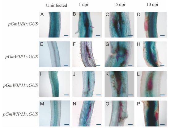 Under SCN infection, pGmUBI roots exhibited strong GUS expression at 1, 5, and 10 dpi. For pGmWIP1, weak GUS expression was observed at 1 dpi, with stronger expression at 5 and 10 dpi. Strong GUS expression was also detected in pGmWIP11 and pGmWIP25 roots at all three stages of infection (1, 5, and 10 dpi) (Figure 8).