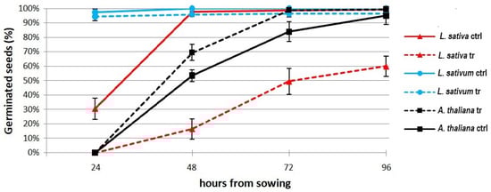 Germination rate of L. sativum, A. thaliana, and L. sativa in Petri dishes containing bibulous paper soaked with 1 mL of 30% diluted compost extract with distilled water (v/v) (tr). The results represent the mean value (±standard deviation) of 4 independent replicates. In the control (ctrl), the seeds are germinated in 1 mL of distilled water (n = 50).