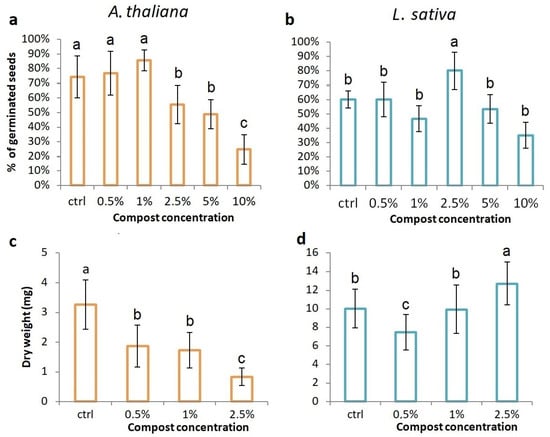 Percentage of germinated seeds after 6 days and biomass production, expressed as dry weight, in A. thaliana (a,c) and L. sativa (b,d) subjected to different concentrations of compost in pots (w/w). Results represent the mean value (±standard deviation) of three independent replicates. Different lowercase letters indicate statistically significant differences at the 95% level.