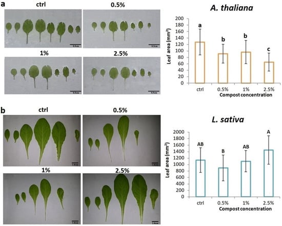 Leaf area is a measure of light interception and is an important parameter for determining plant productivity [50]. In this regard, the measurement of the area of A. thaliana rosettes and the total leaf area of L. sativa were evaluated (Figure 4) at the end of a twentyone DAS period using ImageJ software [27]. The results obtained indicate that in Arabidopsis, leaf area reduced as the compost concentration increased. Plants exposed to 0.5% and 1% compost suffered a slight, albeit significant, reduction in leaf area, while at a concentration of 2.5%, there was a clear decrease. Moreover, as the concentration of compost increased, the number of leaf series also showed a delay in the development of a sixth leaf. In L. sativa, the leaf area showed a different trend: at 0.5% and 1% concentrations of compost, no differences were found compared with the control, despite a slight reduction due to a delay in the development of a fourth leaf. At the 2.5% concentration, there was an increase in leaf area, although this value was not significantly different from the control. A statistically significant difference was found between the compost concentrations of 2.5 and 0.5%.
