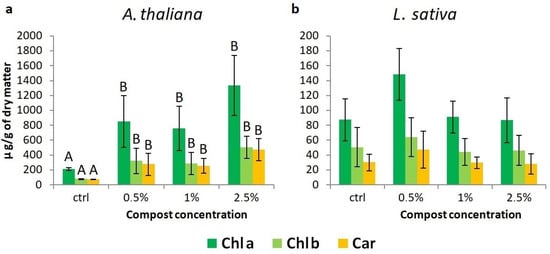 Content of photosynthetic pigments (Chl a, Chl b, and Car) in A. thaliana (a) and L. sativa (b) subjected to different compost concentrations for twenty-one DAS. Results represent the mean value (±standard deviation) of three independent replicates. Different uppercase letters, where present, indicate statistically significant differences at the 99% level, with Chl a, Chl b, and Car analyzed separately.
