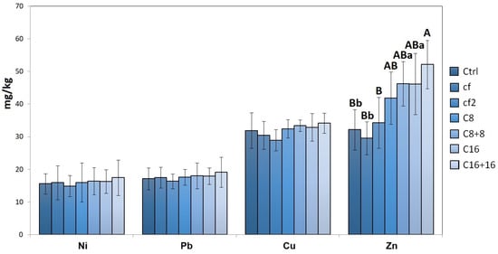Soil concentrations of the four heavy metals were tested according to different treatments. Results represent the mean value (±standard deviation) of three independent replicates. Different uppercase and lowercase letters, where present, indicate statistically significant differences at the 99 and 95% levels, respectively. ctrl: untreated control, C8: SC-OFMSWC at 8 Mg ha−1, C16: SC-OFMSWC at 16 Mg ha−1, cf: chemical ternary fertilizer at 500 kg ha−1, C8+8: second dose of SC-OFMSWC at 8 Mg ha−1, C16+16: second dose of SC-OFMSWC at 16 Mg ha−1, cf2: second dose of chemical ternary fertilizer at 500 kg ha−1.
