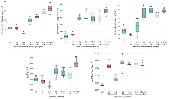 Soil biochemical analyses were performed according to MD 23/02/2004 [35]. Microbial biomass was determined using the fumigation-incubation method, whereas soil respiration was assessed using the titrimetric method. Fluorescein diacetate hydrolysis was measured using 3,6-diacetylfluorescein as the substrate and analyzed spectrophotometrically (CECIL CE1010, Cecil Instrumentation Services Ltd., Milton Technology Centre, Cambridge, UK) by measuring the absorbance of the released fluorescein at 490 nm. Acid and alkaline phosphatase activities were assayed by measuring the hydrolysis rate of p-nitrophenylphosphate, supplied as a substrate, and then measuring the absorbance of the released p-nitrophenol at 400 nm in buffered solutions at pH 6.5 and 11.0, respectively.