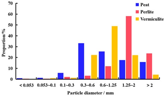 The particle diameter of peat is predominantly distributed within the range of 0.3 to 1.25 mm, accounting for 76.35% of the total. Perlite particles are mainly found in the diameter range of 0.6 to 2 mm, comprising 81.88% of the sample. Vermiculite particles are primarily distributed between 0.3 and 2 mm in diameter, making up 93.56% of the total distribution.
