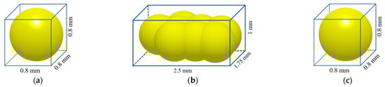 Considering the complex shapes and small sizes of the sowing substrate particles, and taking into account both simulation efficiency and accuracy, a particle simulation model was established in the EDEM 2021 software using a random multiplication method for sphere diameters. As shown in Figure 2, for the blocky peat and vermiculite, a sphere with a diameter of 0.8 mm was used as the reference, and the simulation models were randomly generated with scaling factors ranging from 0.375 to 1.56 and from 0.375 to 2.5, respectively. In the case of the flaky perlite, a combination of eight spheres, each with a diameter of 1 mm, served as the reference, and the simulation models were randomly generated with scaling factors ranging from 0.6 to 2.