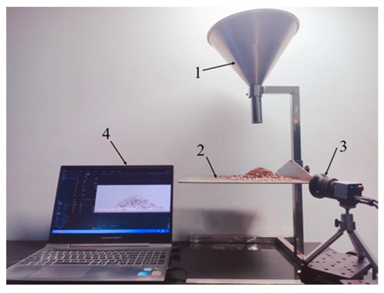 Substrate particle pile image capture test platform: 1—funnel; 2—receiving table; 3—camera; and 4—computer.