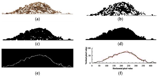 Angle of repose processing procedure: (a) original image; (b) binary image with noise; (c) reduced image; (d) minimal connected domain denoised image; (e) Canny operator with double threshold edge detection; and (f) linear fitting line.