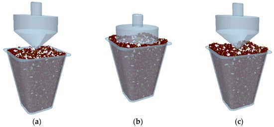 The rational contact mechanics model parameters between particles are essential factors influencing the accuracy of DEM simulations. The contact models investigated for seedling substrates encompass the Hertz–Mindlin with bonding model, which incorporates a bonding radius and fracture criterion to simulate particle cohesion and breakage [8,12]; the elasto-plastic cohesion model (ECM), which employs a piecewise contact mechanics response function to describe the accumulation of plastic deformation during loading–unloading cycles [11,13]; and the Hertz–Mindlin with JKR model, which utilizes the equivalent surface energy parameter to simulate van der Waals forces between moist particles [10]. The contact mechanics parameters between particles are typically calibrated with discrete element simulation and experimental methods [14,15,16,17]. The angle of repose or the static angle of repose were normally used as the response indicator. Parameters such as the static friction coefficient, rolling friction coefficient, restitution coefficient, and JKR surface energy are optimized through Plackett–Burman tests, steepest ascent tests, response surface methodology, and regression analysis [18,19,20]. Previous research demonstrates that the contact mechanics parameters obtained through simulation calibration exhibit high accuracy.