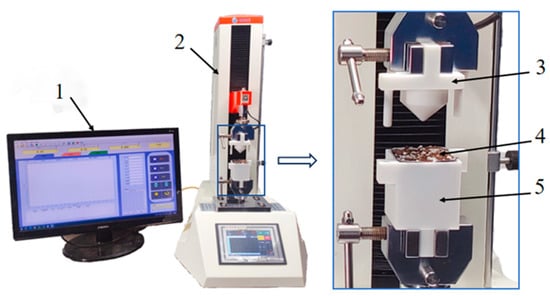 Test platform of pressing hole in sowing substrate: 1—computer; 2—universal testing machine; 3—pressure head; 4—plug tray cell filling with substrate; and 5—plug tray cell support.