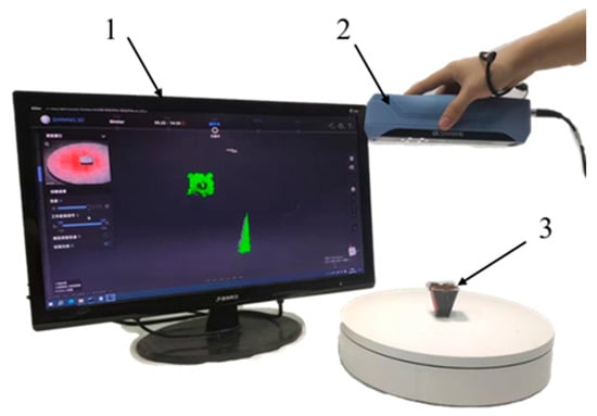 3D scanning test platform: 1—computer; 2—handheld 3D scanner; and 3—pressed substrate hole.