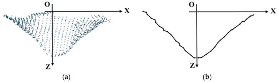 The point cloud data of the pressed hole were tracked, spliced, and deleted with the EXStar v1.0.6.0 software, and then projected onto the XOZ plane, as shown in Figure 11a. In the projected section, edge points were retained, and the background was processed to be white. The Matlab software was used to detect and extract the X and Z coordinates of the edge points. By fitting those edge points, the section contour of the pressed hole is obtained, as shown in Figure 11b.