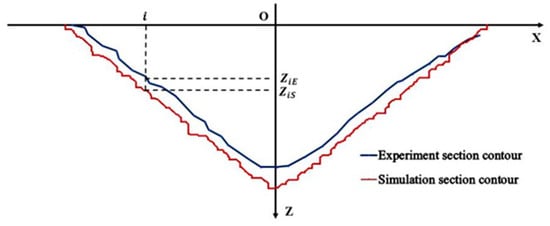 Comparison of the experimental and simulation section contour of the pressed hole is shown in Figure 12. Along the X-axis, sampling points are set with 2 mm intervals on either side of the central origin O. At the sampling point , the Z-axis coordinate values corresponding to the simulated and experimental section contours, denoted as and , are recorded. The mean simulation depth and the mean experimental depth are calculated by Formulas (10) and (11). The deviation between the mean simulation and experimental depth is defined as shown in Formula (12).