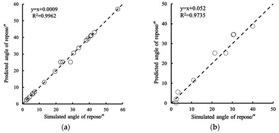 Comparing predicted and simulated values of angle of repose: (a) training dataset; (b) testing datasets.
