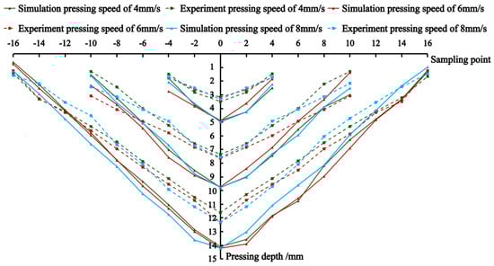 The simulated and experimental results of pressing hole in the sowing substrate are shown in Figure 14. For different pressing depth and speed, both simulation and experimental results show that pressed conical holes were formed within the sowing substrate, characterized by the maximum depth at the center sampling point and progressively decreasing towards the end sampling points.