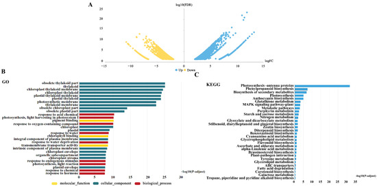 The distribution and functional classification of differentially expressed genes (DEGs) based on the bulked segregant RNA sequencing (BSR-Seq) of the resistance and susceptible bulks of L709 × Langdon. (A) The distribution of the DEGs using a volcano plot. (B). A Gene Ontology (GO) analysis of the DEGs. (C) A Kyoto Encyclopedia of Genes and Genomes (KEGG) pathway analysis of the DEGs.