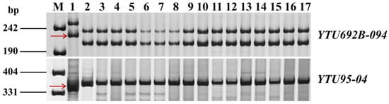 Amplification results of molecular markers YTU692B-094 and YTU95-04 in 15 representative wheat cultivars/breeding lines. M, pUC19/MspI; lane 1, resistant parent L709; lane 2, susceptible parent Langdon. Lanes 3–17 indicate partial powdery mildew-susceptible wheat cultivars/breeding lines derived from multiple major wheat-producing areas and possessing excellent agronomic and yield traits: Yannong 5158, Saidemai 16, Shengmai 116, Yunchengxiaomai, Tai 4123, Nongda 4538, Zhengmai 16, Xinmai 23, Yumai 49, Shimai 15, Shinong 086, Taimai 101, Huaimai 23, Chang 6878, and Jimai 19. Red arrow indicates polymorphic band.