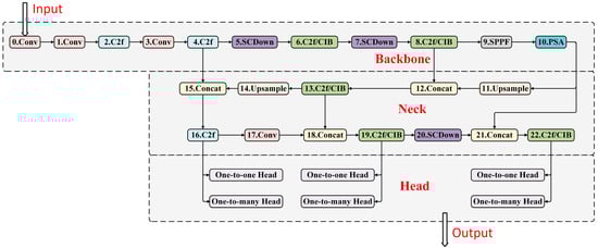 To enhance the readability of Figure 2, different colors are used to represent various functional modules in the YOLOv10 network. Specifically, pink blocks represent standard convolutional layers (Conv), light blue blocks indicate C2f modules, purple blocks denote SCDown modules, green blocks correspond to C2f/CIB modules, gray blocks represent the SPPF module, cyan blocks indicate the PSA module, light yellow blocks are used for Concat operations, and light pink blocks represent Upsample operations.