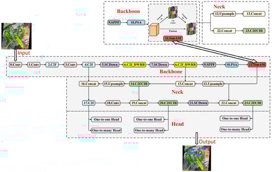 In natural growth environments, green peppers vary significantly in size and shape, and leaves and branches closely match the fruit in color, causing mutual occlusion. In addition, multi-scale factors such as varying illumination intensity and angles can degrade model performance. To address feature extraction across different scales under field conditions, a lightweight DSW-YOLO model was proposed based on YOLOv10n by continually strengthening feature extraction. The structure of the optimized DSW-YOLO model is shown in Figure 3.