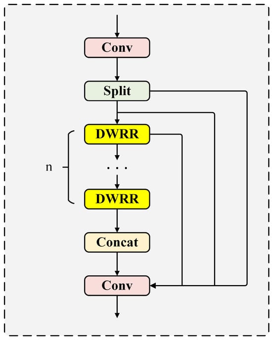 In Figure 4, yellow blocks represent the DWRR module, light green blocks indicate the split module, light pink blocks denote the convolution branches, and light yellow blocks correspond to the Concat module.