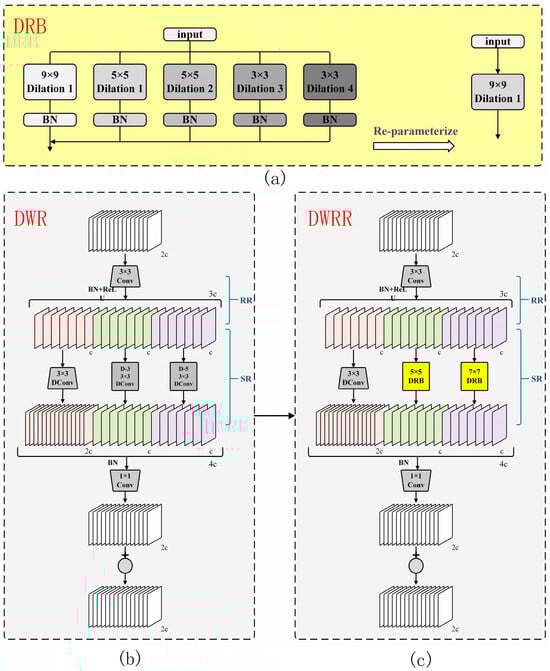 It was observed that both the DRB block proposed by Ding et al. [] in UniRepLKNet and the DWR block introduced by Wei et al. [] in DWRSeg adopt dilated convolutions for an expanded receptive field, utilizing various dilation rates across multiple layers. However, the deep convolutional layers in the original DWR framework (such as D-3 and D-5 dilated convolutions) still lead to certain computational inefficiencies. To address this issue, we propose replacing deep convolutions with Dilated Reparameterization Blocks (DRB). The specific reasons are as follows: