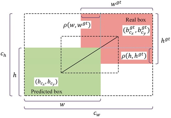 Loss function parameter illustration diagram (“Real box” denotes the ground-truth or label box, and “Predicted box” denotes the box predicted by the algorithm. (,) represent the center coordinates of the real box, while (,) represent those of the predicted box. In Equation (4), IoU (Intersection over Union) represents the ratio of the intersection between the predicted and real boxes. denotes the Euclidean distance between the real and predicted boxes; and denote the height and width of the predicted box; and denote the height and width of the real box; and denote the height and width of the smallest enclosing box formed by the predicted and real boxes).