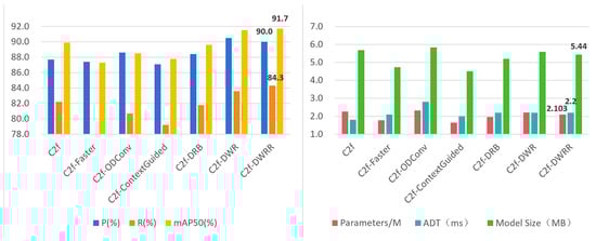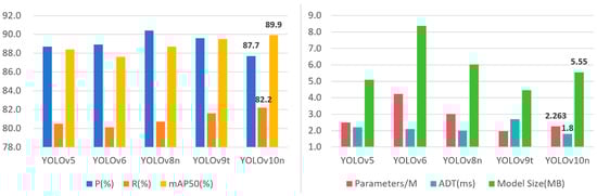 As shown in Figure 8, YOLOv10n demonstrates the best overall performance among lightweight YOLO models, with outstanding R and mAP50 results, the shortest ADT, and balanced parameters and model size. Detailed numerical comparisons of the baseline models are provided in Table 4.