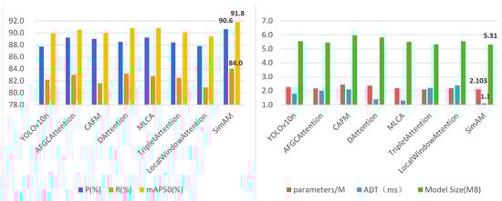 As shown in Figure 10, integrating SimAM significantly improves the model’s recognition accuracy in complex scenarios, reduces detection time, and enhances sensitivity and responsiveness to critical information. Detailed numerical results regarding the impact of different attention mechanisms on model performance are presented in Table 6.
