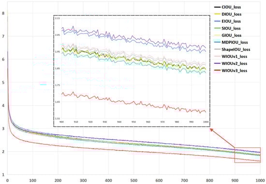 As shown in Figure 11, WIoUv3 achieves the lowest loss value and fastest convergence among all tested methods. This indicates that the network benefits from WIoUv3’s improved localization quality and stable learning process. Compared with traditional IOU-based losses, WIoUv3 introduces a dynamic focusing mechanism that adaptively weights anchor box contributions during training. This helps the model better distinguish high-quality anchors while suppressing noisy or ambiguous samples, thus facilitating more robust training.