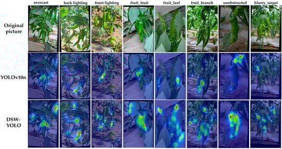 As shown in Figure 12, whether under overcast conditions, backlit sunlight, direct sunlight, or with fruit-to-fruit, fruit-to-leaf, and fruit-to-branch occlusions, DSW-YOLO shows higher attention to green peppers and occluded areas compared with the original YOLOv10n. This indicates that the proposed improvement modules effectively mitigate the impact of varying illumination and different occlusion types in complex environments. Furthermore, DSW-YOLO maintains strong attention even in unobstructed and blurred-object scenarios, suggesting robust performance in diverse conditions.