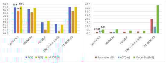 Figure 14 shows that DSW-YOLO outperforms the other models in terms of both overall accuracy and lightweight design. The detailed comparison between DSW-YOLO and YOLOv10n is presented in Table 9.