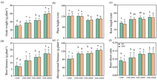 Agronomic traits of four rive type across breeding eras. (a) Grain weight; (b) Plant height; (c) Root length; (d) Root biomass; (e) Aboveground biomass; (f) Root-shoot ratio; <1940 refers to ancient rice (<1940), 1940–2000 refers to early conventional rice (1940–2000), 2000–2020C refers to modern conventional rice (2000–2020), and 2000–2020Z refers to hybrid rice (2000–2020), P0 represents low P stress treatment, and P50 represents normal P application treatment. Different lowercase letters indicate statistically significant differences among the four rice types within each P treatment.