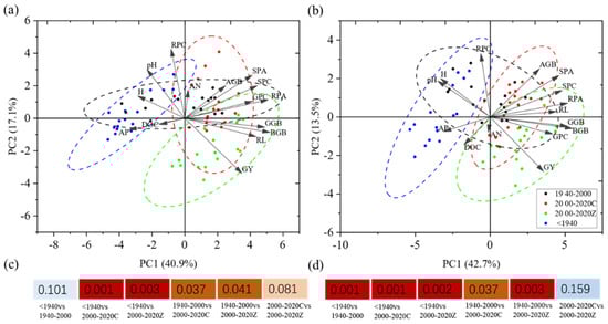 Principal component analysis (PCA) of agronomic traits, P uptake, and rhizosphere soil chemical properties was conducted to assess differences among rice varieties. Under low-P conditions, significant differences were observed among the four rice types, except between ancient varieties and early conventional rice, as well as between model conventional rice and hybrid rice (Figure 5a,c). Similarly, under normal P application, significant differences were found among rice types, except between model conventional rice and hybrid rice (Figure 5b,d).