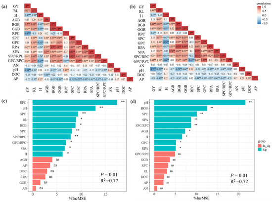 Correlation analysis of agronomic traits, rhizosphere chemical parameters, and P uptake in rice under low P treatment (a) and normal P treatment (b); (c,d) show the comprehensive influencing factors of yield based on the random forest model under low P and normal P treatments, respectively. GY: Grain weight, H: Plant height, RL: Root length, BGB: Root biomass, AGB: Aboveground biomass (including grain weight), GGB: Root-to-shoot ratio, RPC: Root P content, SPC: Stem P content, GPC: Grain P content, RPA: Root Paccumulation, SPA: Stem P accumulation, AN: alkali-hydrolyzable nitrogen, DOC: dissolved organic carbon, AP: available P. “ns” indicates no significant difference at p > 0.05, “*” indicates significant difference at p < 0.05, and “**” indicates highly significant difference at p < 0.01.