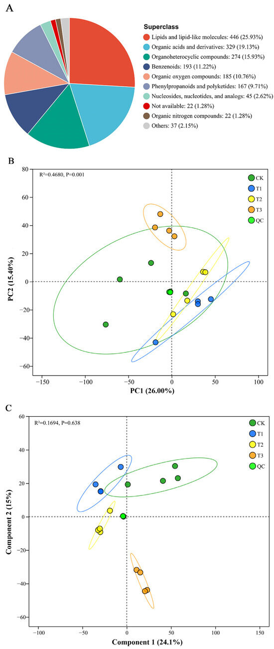 2.6. Non-Targeted Metabolome Detection for Soils and Data Analysis
