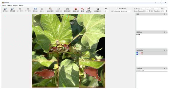 We manually marked the mask position of the top buds in each image using Labelme [32] (Version 5.6.0). Labelme is an annotation tool for labeling the pixel distribution area of the object to be recognized. It generates a polygon through a set of manually selected coordinates as corner points, uses this polygon as the mask of the instance, and records the instance label. The interface of Labelme is shown in Figure 2. The XML file generated after annotation records the coordinates of each corner point of the polygon; the coordinates are established with the image’s upper-left corner serving as the origin. Converting the coordinate value to the ratio of the relative image resolution can be converted into the label file format required by YOLO.