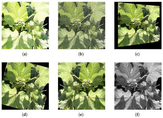 Data enhancement example: (a) random brightness adjustment; (b) noise addition; (c) tangential transformation; (d) random rotation; (e) mirror transformation; (f) graying.