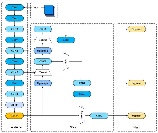 As shown in Figure 4, the YOLO11n-seg algorithm consists of three parts: backbone, neck, and head. The backbone extracts three-scale feature layers and outputs them to the neck. The feature pyramid network in the neck fuses and enhances high-dimensional and low-latitude information and then inputs them into the segmentation head of the corresponding dimension in the head. After nonmaximum suppression processing, the algorithm only output the optimal solution of the anchor box and the mask.